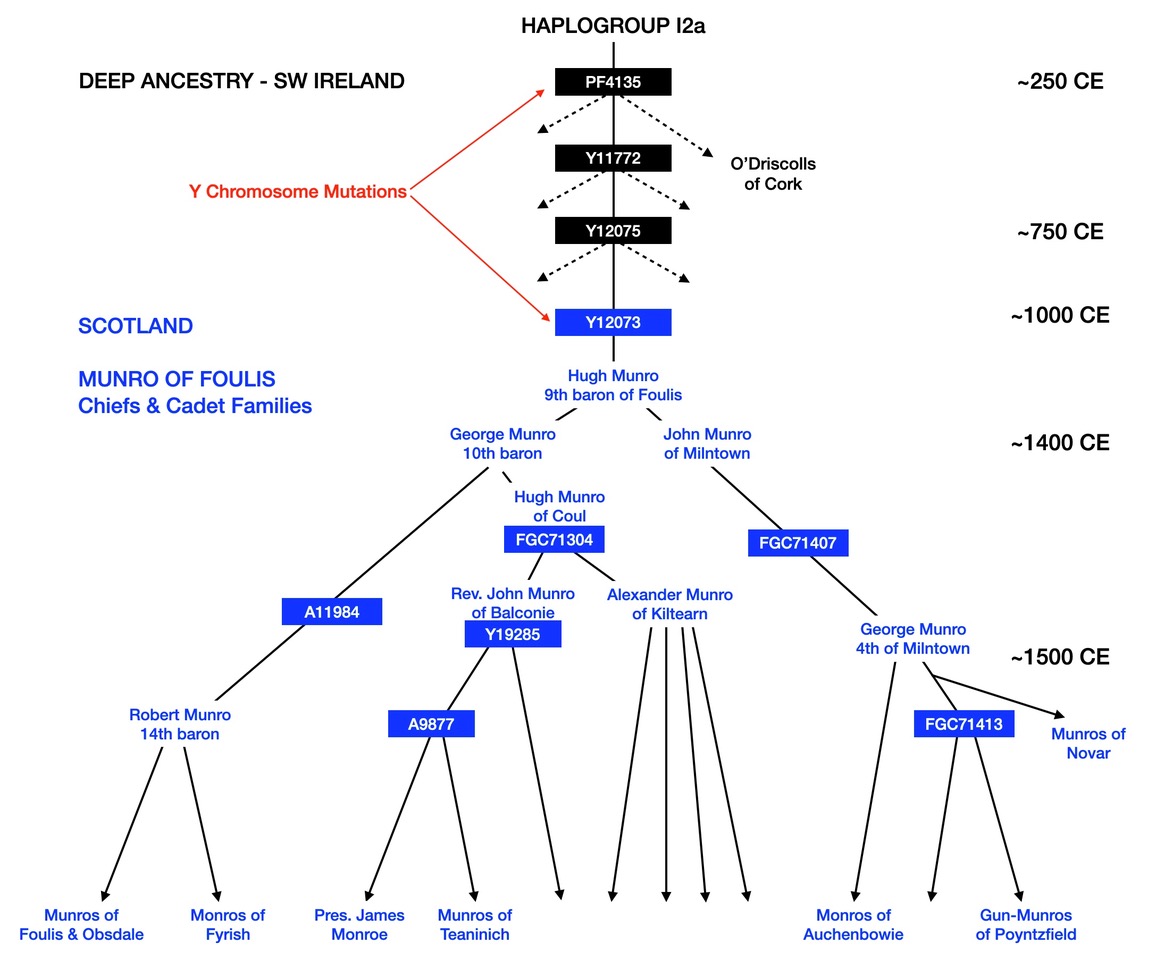 Studies of the DNA of the Y or male chromosome allow investigation of the deep ancestry of the Munro of Foulis male line to confirm or refute this tradition. From time to time a mutation occurs in the Y chromosome; these rarely have any effect on it, but they are is passed from father to son through all male descendants. Men bearing a particular mutation must have a common male an-cestor in whom it first occurred. Mutations occur randomly over time, but the average rate of an accumulating series of mutations permits the branching of the male tree to be followed over time.